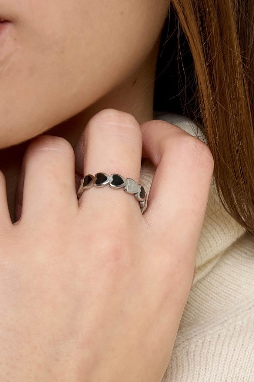 Todas las piezas están disponibles tanto en dorado como en plateado. Los anillos se pueden encontrar con los corazones en negro, rosa y rojo.