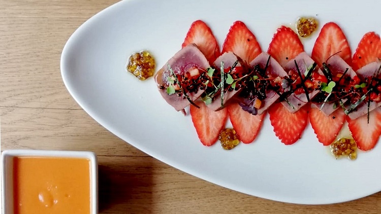 Lomo de atún con Salmorejo y carpaccio de fresas