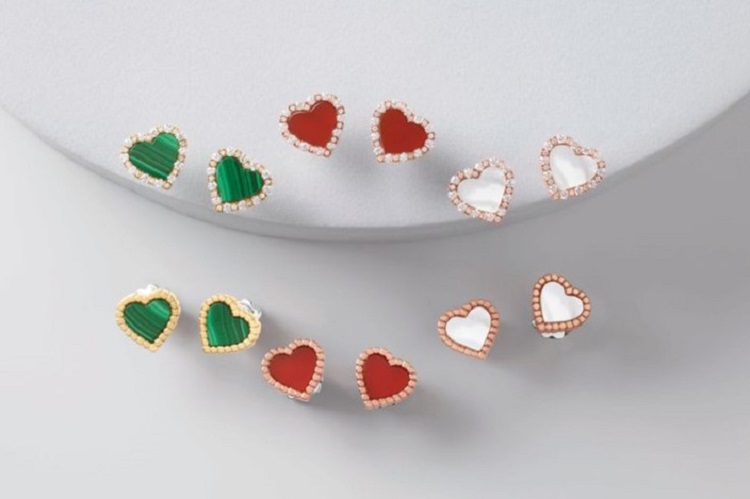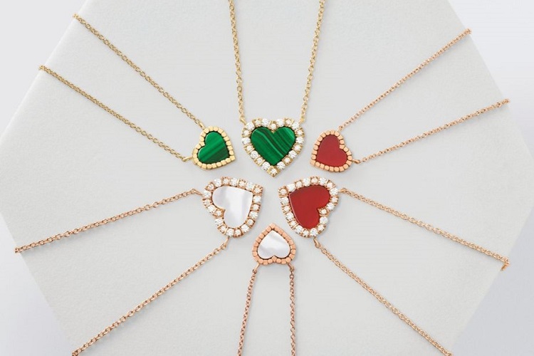 El resultado es una línea de collares y pendientes en la que el icónico diseño Belle Époque, en oro rosa o amarillo -enriquecido con pavé de diamantes en sus versiones más preciosas-, enmarca, a través de un juego de círculos y rectángulos, un elemento central en forma de corazón de nácar, cornalina o malaquita, creando una deslumbrante explosión de color.