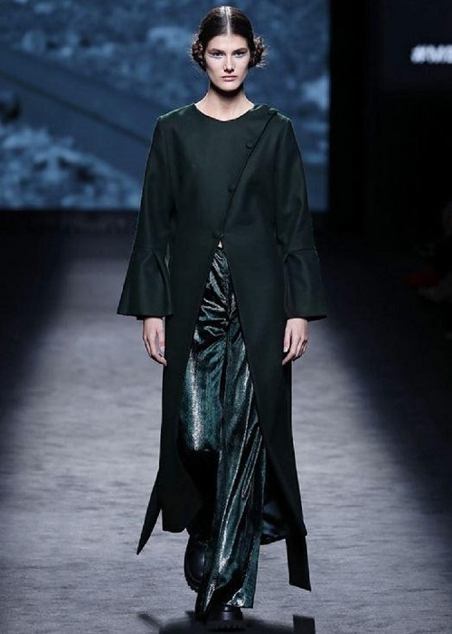 Los sentimientos encontrados se armonizan en looks que exponen el contraste de texturas. Las escenas más íntimas, la búsqueda de la belleza sutil y sensible suena a través de finos rasos, transparencias, tejidos vaporoso y delicados reflejos que se abren paso sobre la fuerza de un paisaje más abrupto, compuesto por prendas de abrigo de tacto firme y tenaz como la lana.
