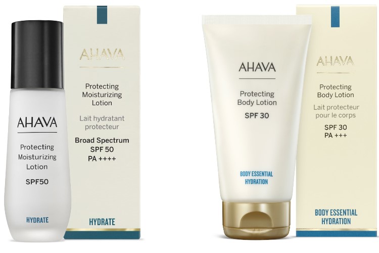 AHAVA, la marca cosmética que utiliza minerales del Mar Muerto amplía su gama y por primera vez lanza productos con factor de protección solar, que incluyen una Loción Facial Hidratante Protectora SPF50 y una Loción Corporal Protectora SPF30.