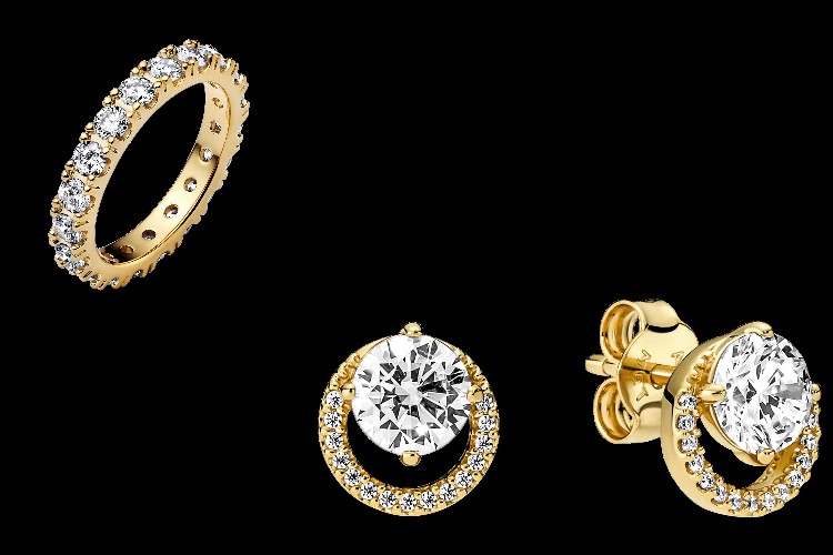 Para combinar su vestido dorado de corte sirena y lentejuelas, Edurne ha elegido cubrir su muñeca con tres pulseras icónicas de la colección Signature Gold y lucir unos pendientes de botón y una selección de anillos con un recubrimiento en oro de 14k e incrustaciones de brillantes con circonitas cúbicas transparentes.