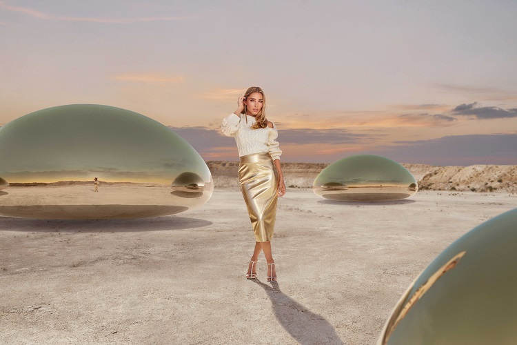 La nueva aventura comienza jugando con el brillo dorado de una falda de Sfera de reminiscencia espacial combinada con un suéter de Tintoretto en una imagen de máxima tendencia que invita a adentrarse en este escenario de ensueño en que la moda, con su fuerza, es la protagonista.