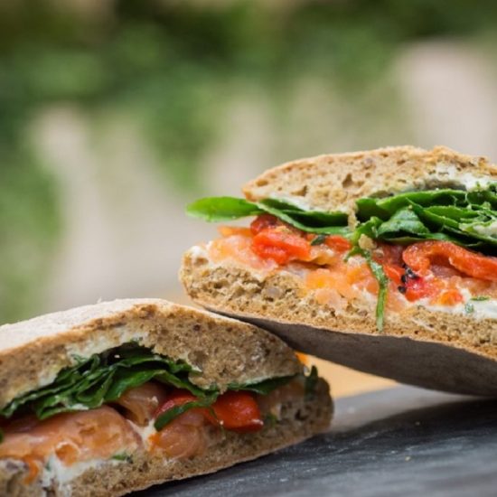 Desmigarlo en trozos y ponerlo sobre las naranjas peladas y cortadas en rodajas partidas a la mitad.