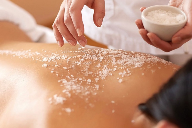 3. Seguidamente se realiza una exfoliación de toda la espalda con un producto con gránulos naturales de rosa mosqueta y extracto de naranja amarga rica en AHA´s.