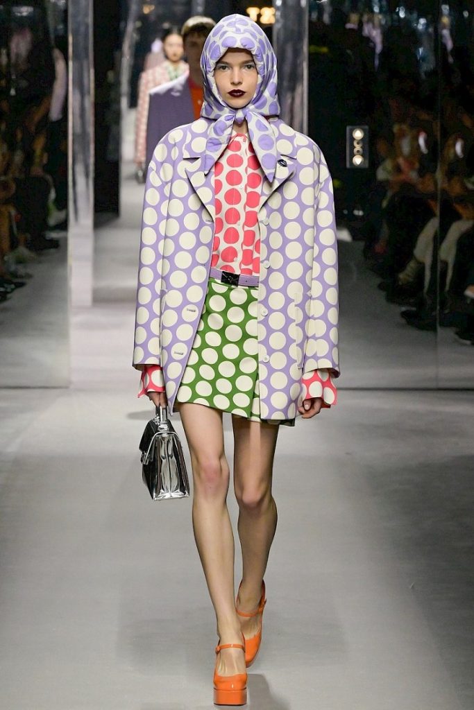 La metamorfosis del color anima la evolución del desfile, en un ritmo marcado por símbolos, geometrías y motivos cuya repetición en serie se convierte en una réplica de los ciclos de la naturaleza y de la producción industrial.