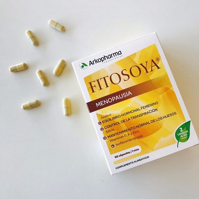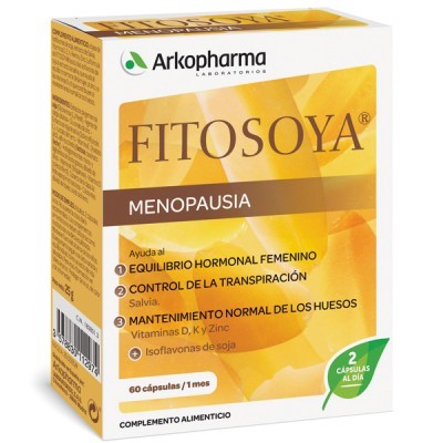 FITOSOYA ISOFLAVONAS  de arkopharma es un complemento alimenticio a base de isoflavonas de Soja, extracto de Salvia, Vitaminas D, E, K, Hierro y Zinc. ayuda al equilibrio hormonal de la mujer, al zinc y las vitaminas D y K que contribuyen al mantenimiento normal de los huesos.
