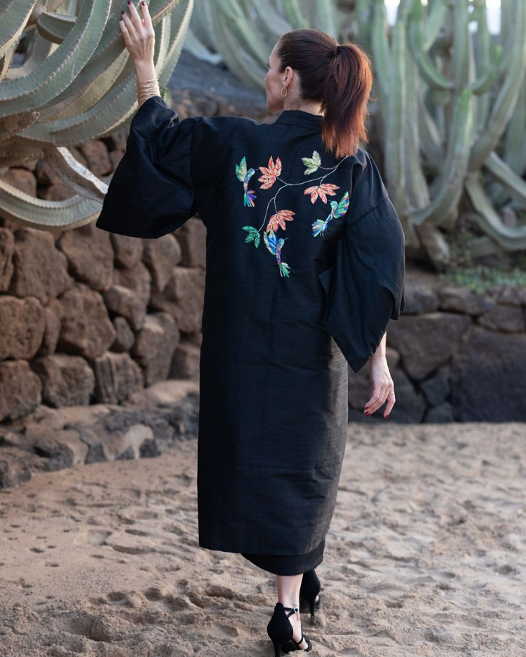 Entre las propuestas más sorprendentes de esta temporada están los kimonos artesanales de Rosa Delgado, una firma canaria que ha convertido la delicadeza y la autenticidad en su sello personal.