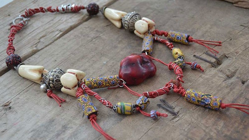 Para su confección selecciona con exquisito cuidado cada componente, ya sean regalos de la naturaleza (piedras semipreciosas, perlas, corales, ámbar, conchas, semillas, cuero, maderas, cuarzos, piritas, ágatas…) o fruto de un trabajo artesanal realizado de manera individual (bronces a la cera perdida, cuentas de cristal fundidas en forjas de arena, terracotas,…), que hacen que cada NOK sea único por sus componentes y elaboración.