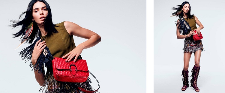 La otra estrella de la campaña es el bolso Amazone en su versión de cuero rojo acolchado, que Kendall lleva cruzado con una correa de estampado leopardo, mientras que otras fotografías presentan las versiones con flecos y de estampado pitón que se pudieron ver en la pasarela el pasado septiembre.