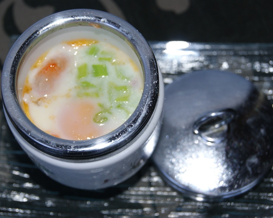 Untar el tarro con aceite de oliva, si os gusta podéis frotar el tarro con un diente de ajo por dentro antes de incorporar el huevo, con los ingredientes elegidos. No llenar demasiado.