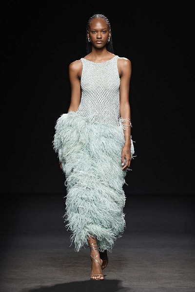 La colección bebe del lujo desbordado de los años 20 y del descaro elegante de los 90, fusionando brillos, siluetas que acarician el cuerpo y una feminidad que se celebra sin disculpas.
