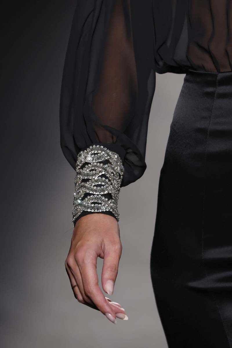 Detalles: galones bordados a mano con cristales, acabados minuciosos y un brillo contenido que evoca esplendor, juventud y deseo.