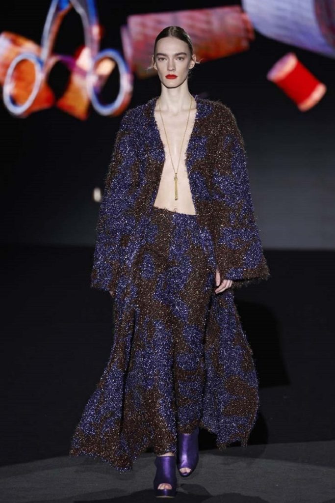Un recorrido, a través de la variedad de tejidos: los cálidos paños, los atrevidos lamés, los esenciales tafetanes, los mágicos brocados y las novedosas organzas, fusionan la pasión terrenal con la más experimental de su trayectoria.