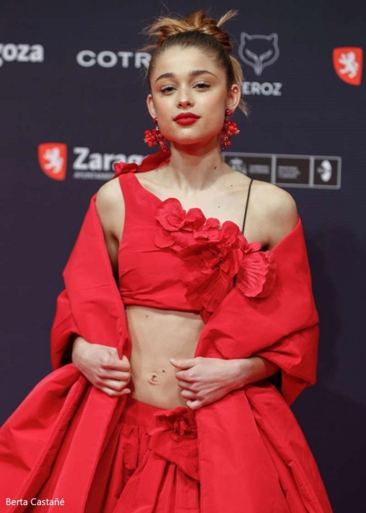 Berta Castañé, la joven actriz que acaba de estrenar el thriller de Movistar+ «Todos mienten», y que participa también en la próxima serie de ATRESplayer PREMIUM, «Heridas», no dejó indiferente a nadie, con su atrevido conjunto rojo y un recogido alto con mucha fantasía, elaborado por el equipo de Cotril España.