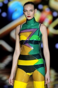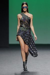 ANDRÉS SARDÁ. Contrastes , creatividad y recuerdo de los 80 en su colección ‘Pop it up’. Su propuesta en cuatro bloques: el aerobic y la puesta en forma, los videojuegos, los videoclips y las series televisivas. La firma catalana utiliza charol, tejidos metalizados, plástico y colores vivos que combinan entre estampados y tonos planos.