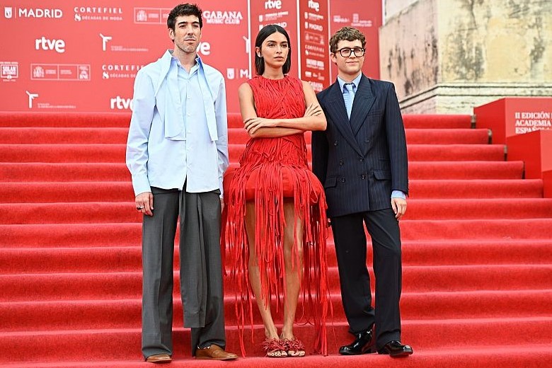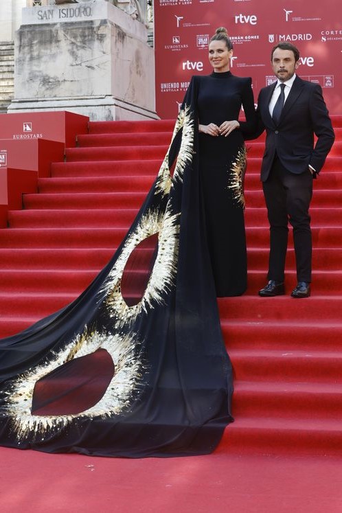 La actriz ha posado en las escalinatas con un diseño exclusivo de Rubén Hernández Costura, un imponente vestido en un sobrio color negro, inspirado en las puestas de sol del Mediterráneo. Está realizado en crepé de seda con hombreras marcadas y mangas asimétricas, con bordados en pan de oro e incrustaciones de cristal.
