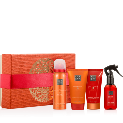 The Ritual of Happy Buddha. En la China de hace 1100 años, Laughing Buddha era un famoso monje cuya legendaria sonrisa traía alegría donde quiera que fuera. Durante siglos, frotar su vientre atraía buena suerte y prosperidad. Esta tradición es la inspiración para una colección de productos energizantes que celebran su positividad. Infundido con naranja dulce y la poderosa madera de cedro, nuestra energizante .Esta colección añade una dosis de felicidad a tu vida diaria.