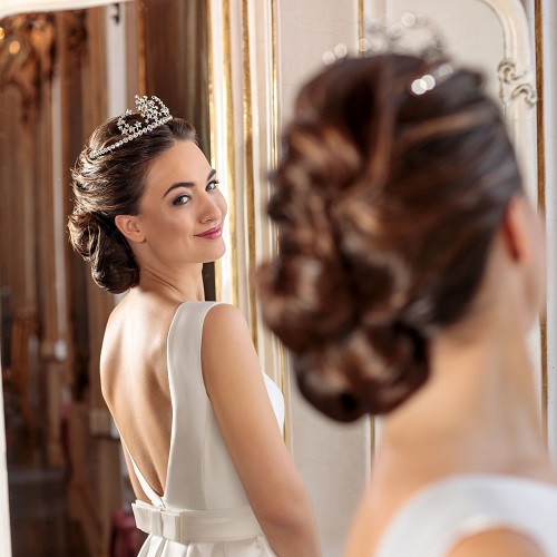 El tocado presenta 72 cristales de colores claros, con tres estallidos de piedras en forma de estrella, y una línea de cristales circulares que decoran la base.