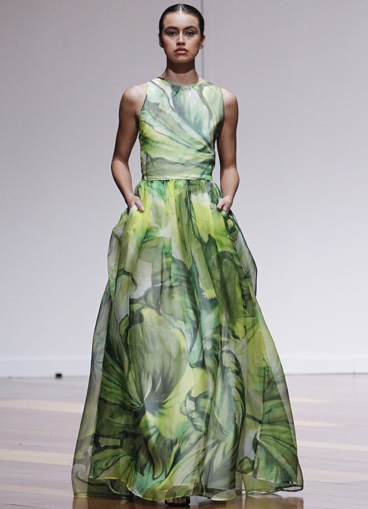 El homenaje a la tierra y su flora es innegable, como si cada prenda intentara plasmar un paisaje diferente: desde los verdes profundos de los bosques hasta estampados florales inspirados en praderas en plena floración. Una colección pensada para novias vivaces, alegres y sin complicaciones.