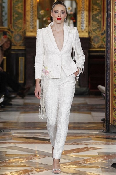 Para ellas, el diseñador propone un lazo que cae desde el cuello, un abrigo-capa o un accesorio de impacto que se funde con la arquitectura del vestido. “Buscamos crear dramatismo, un efecto de arrastre, un momento especial, sin necesidad de seguir la tradición al pie de la letra”, explica.