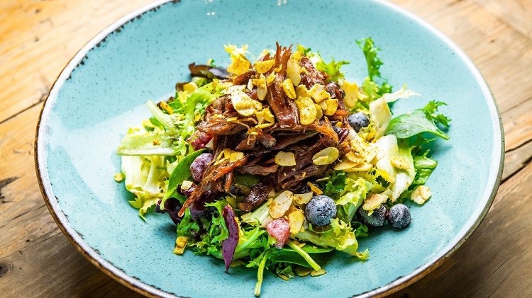 Pura proteína con frutos rojos y almendras al curry como aderezo. Incluye manzana Granny Smith, mantequilla, miel y vinagre de Jerez. Las hebras de confit de pato se sirven asadas pero crujientes. (Bendita locura)